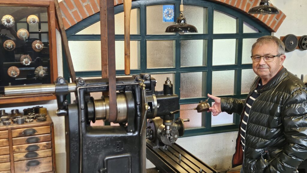 Durante el recorrido se enamoró de una fresadora Casals del año 1905 y decidió apadrinarla. Aquí tenemos la prueba: cuidando y engrasando esta histórica máquina catalana para contribuir a su conservación.